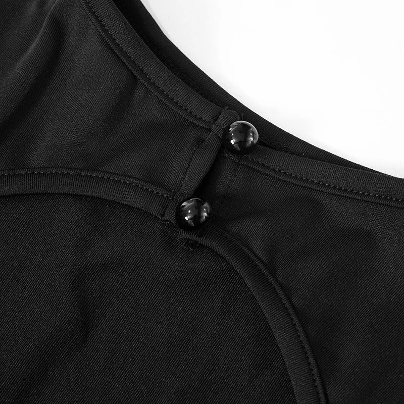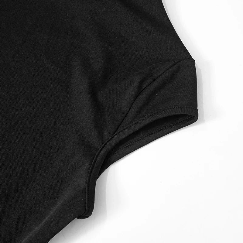 Vestido corto ajustado de manga corta y cuello alto recto. Escote en la espalda con apertura ovalada.
