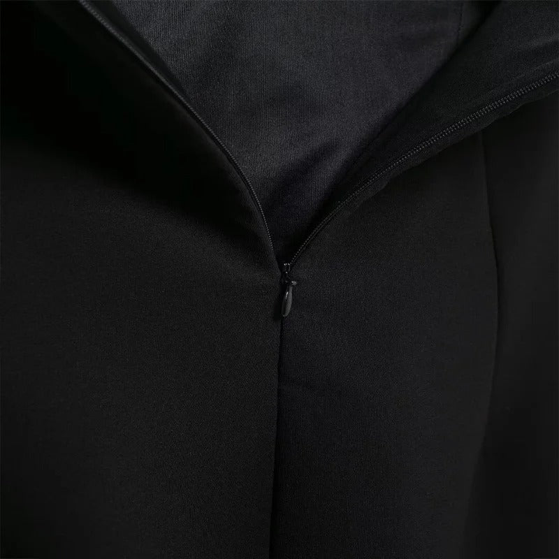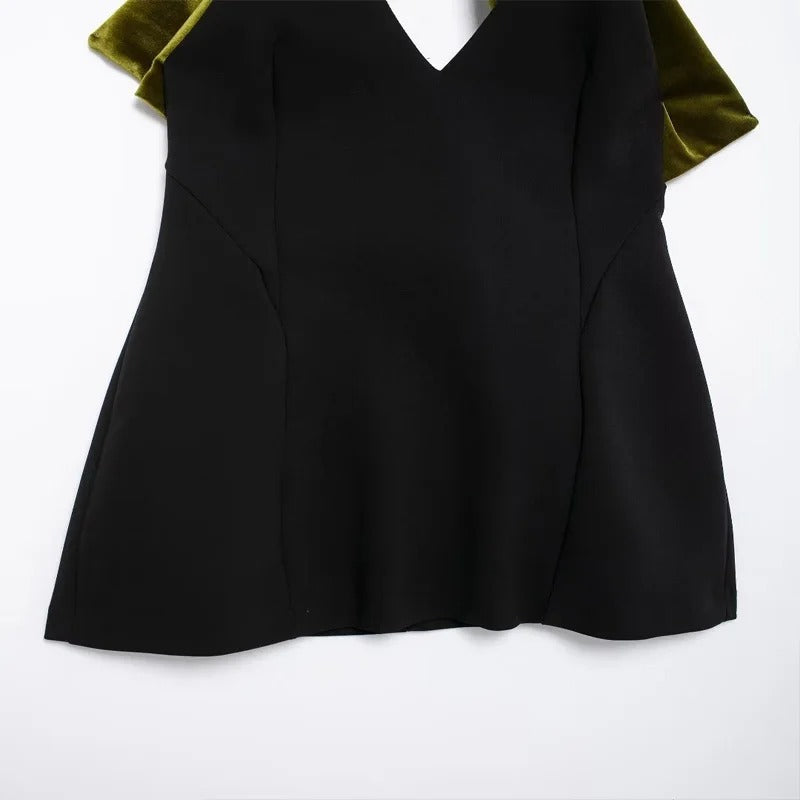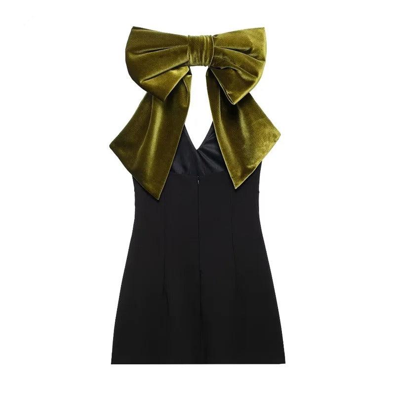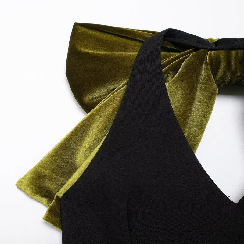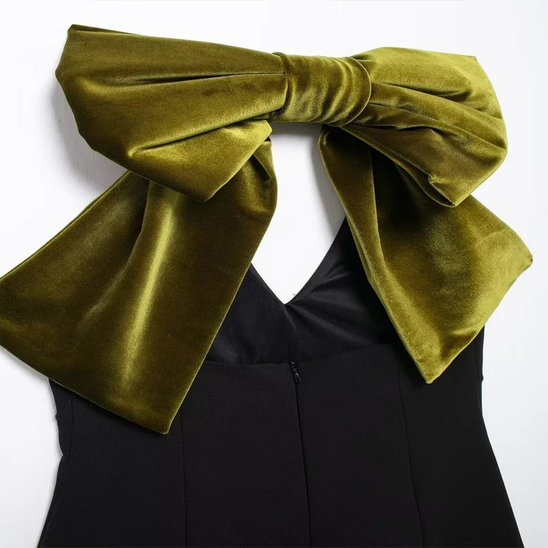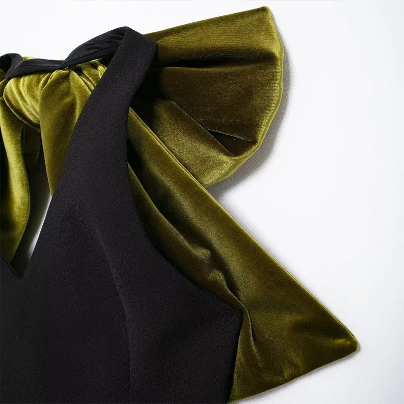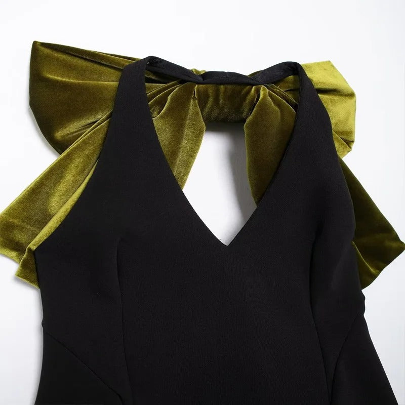 Vestido con escote halter corto. Detalle de lazo aterciopelado en color de contraste en la parte trasera del cuello.