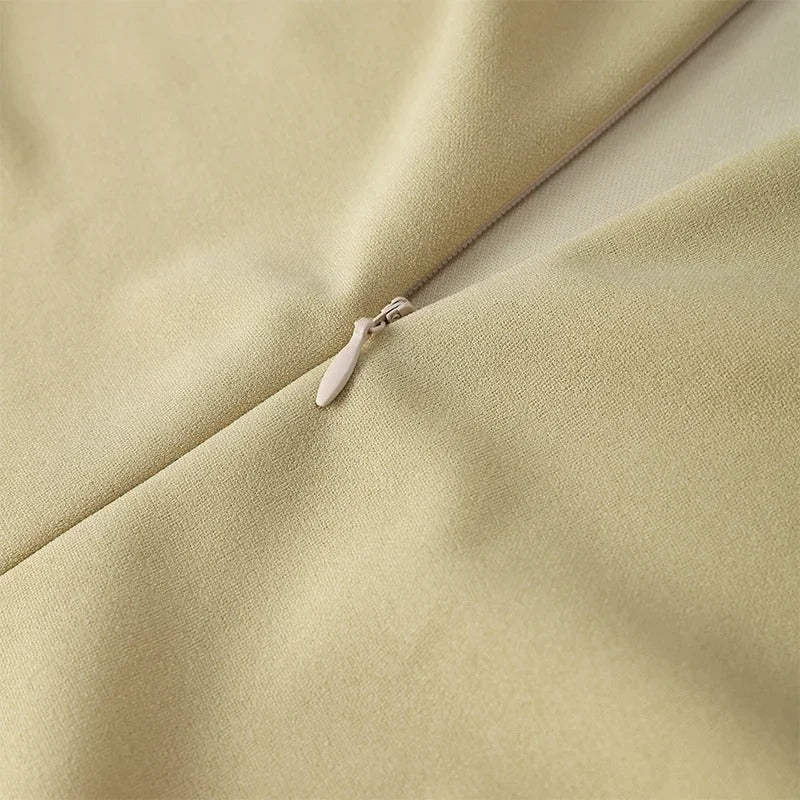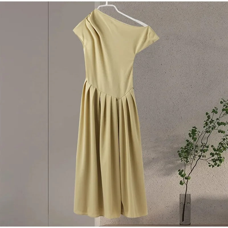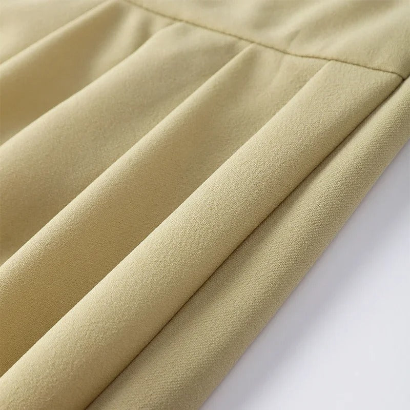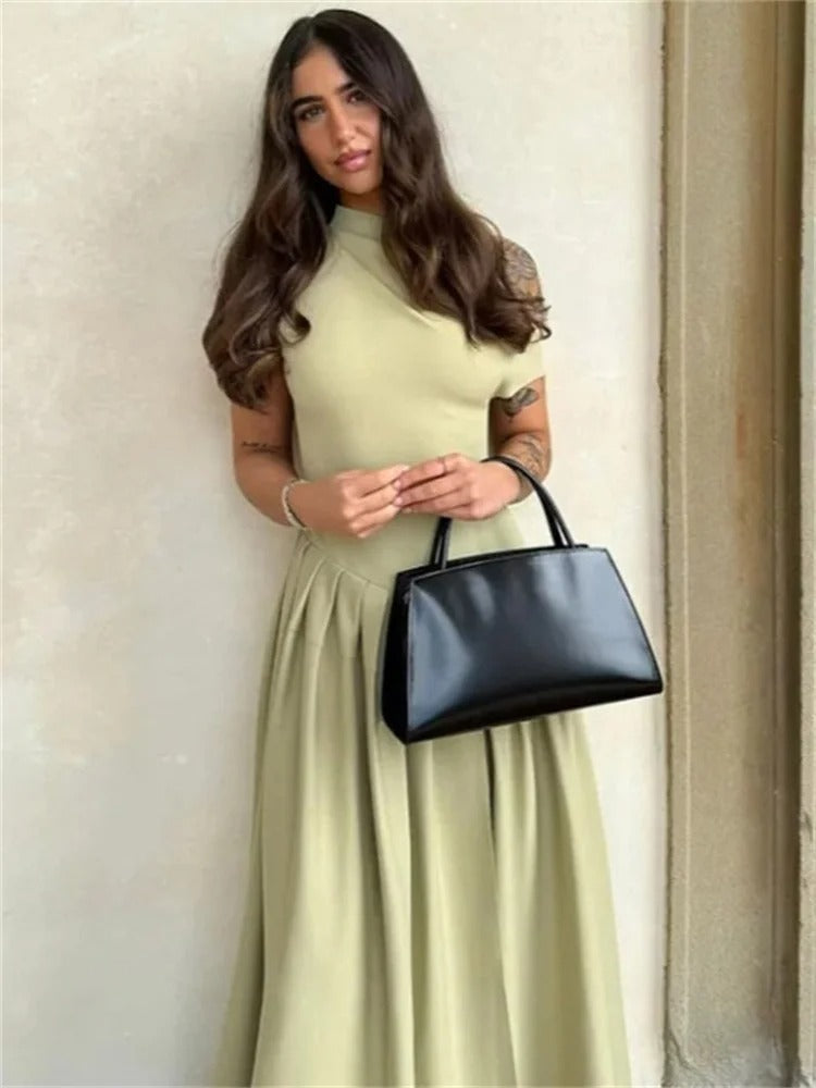 Diseño de falda plisada con vuelo. Corte en la cadera caído asimétrico. Manga corta recta con cuello alto.