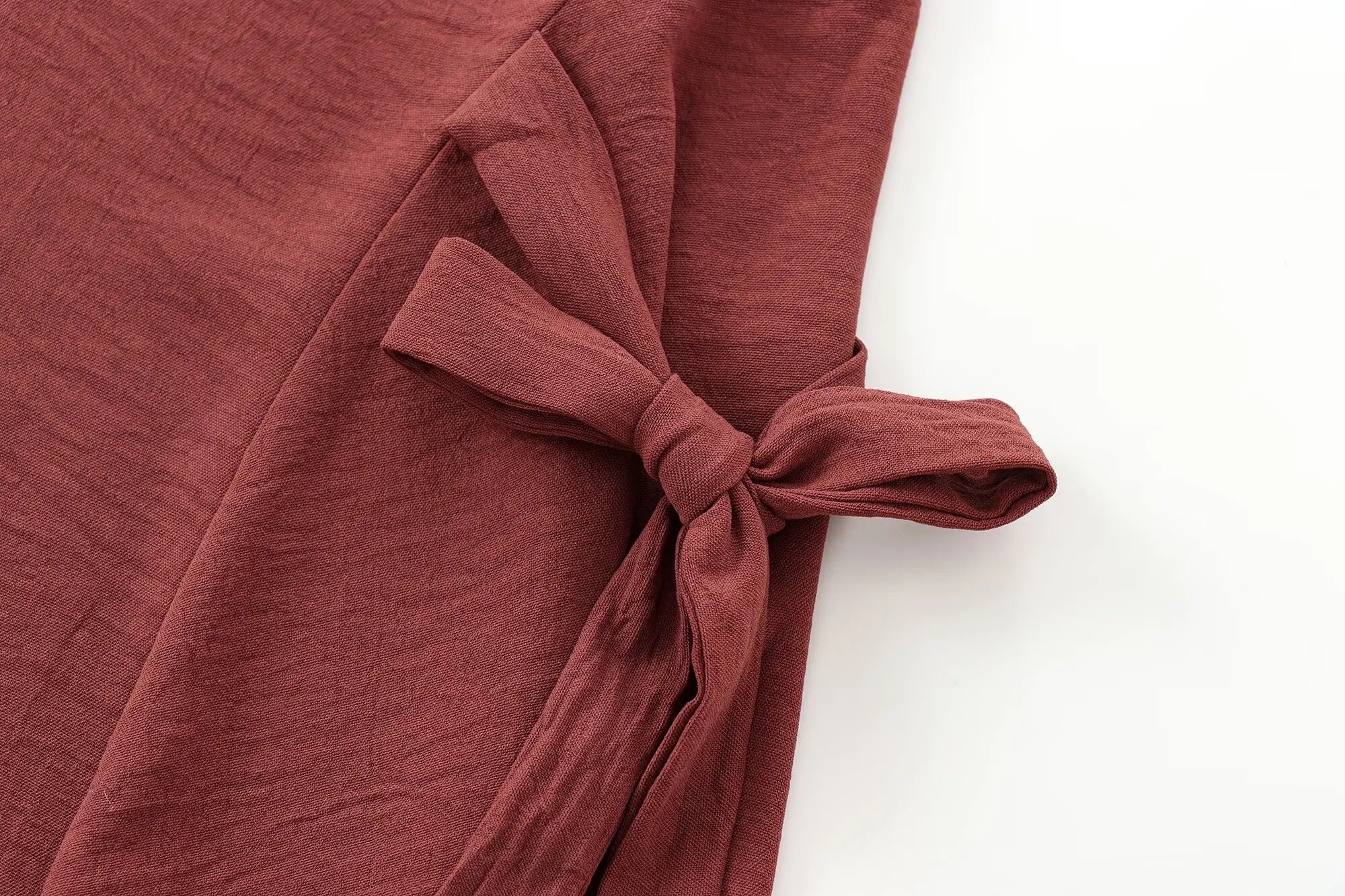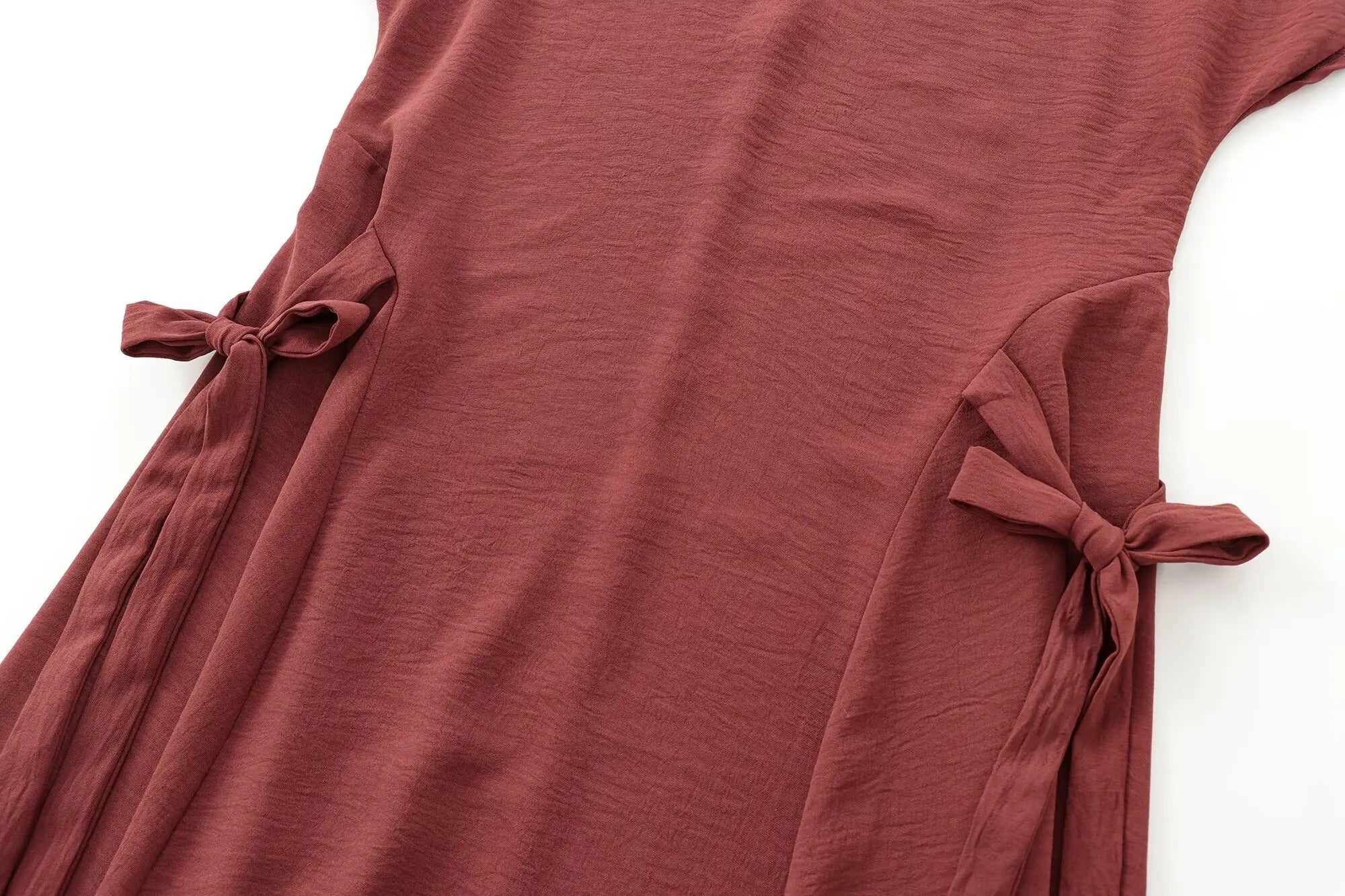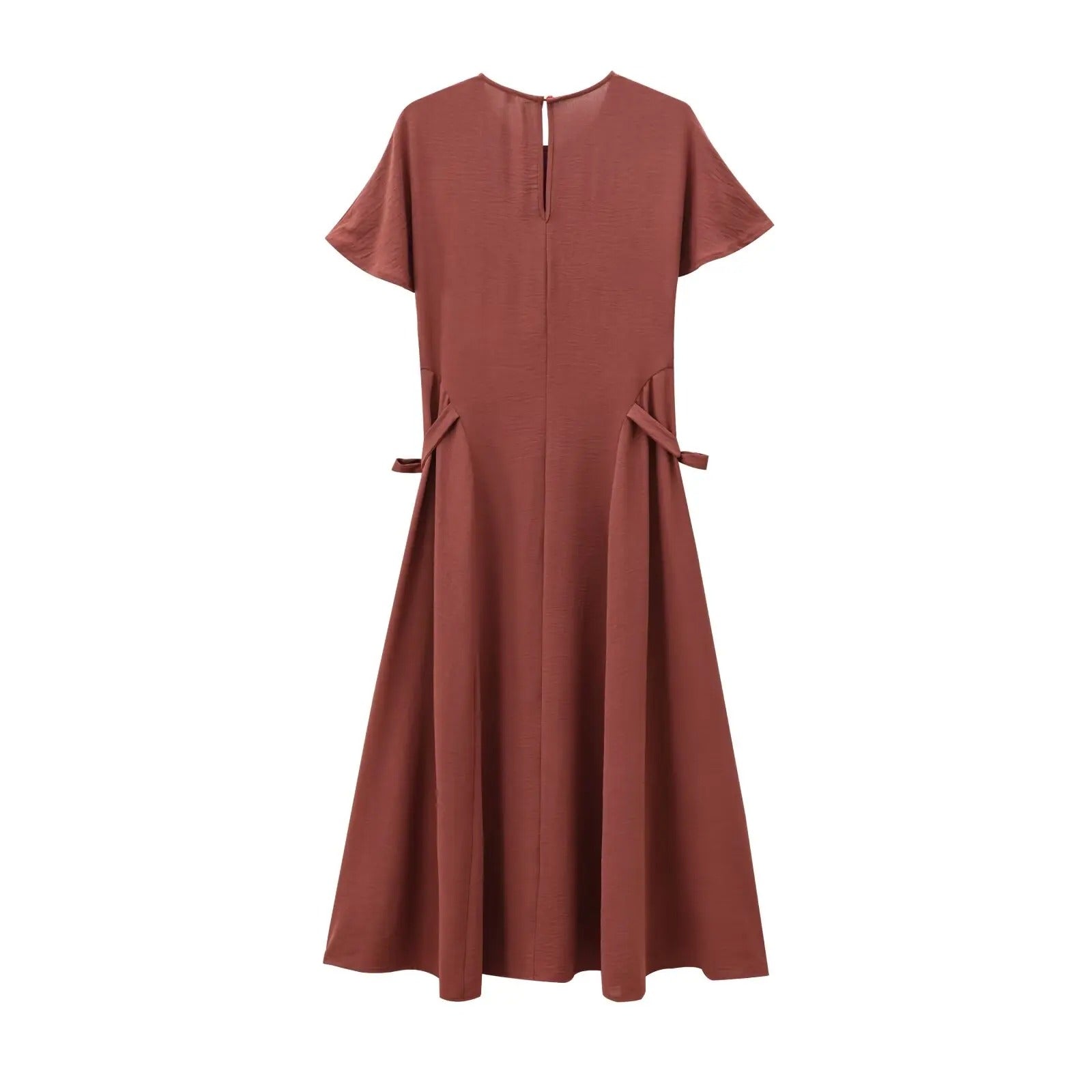 Diseño de largo midi. Cuello redondo. Manga corta holgada. Ajuste de lazos en los laterales. Color teja.