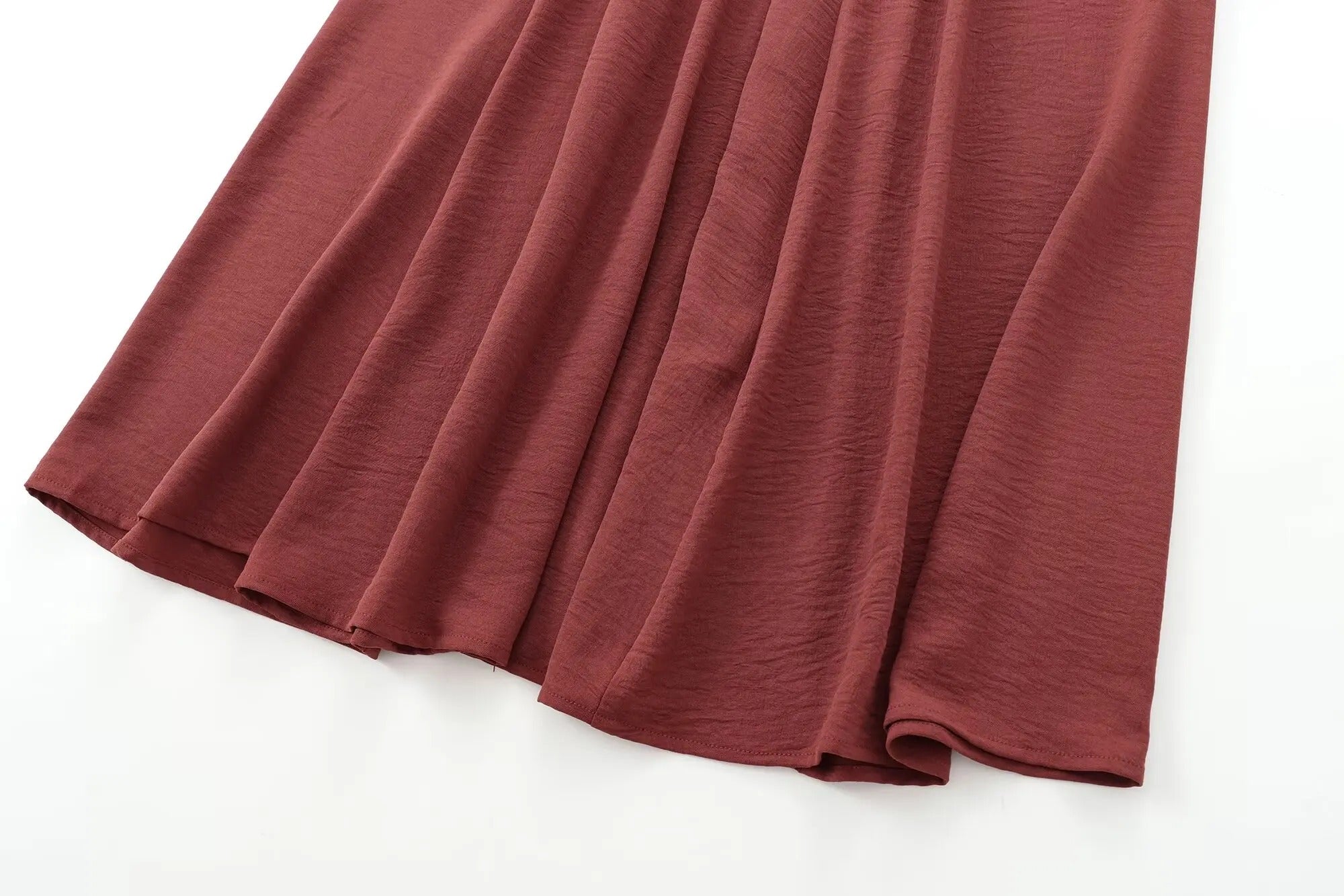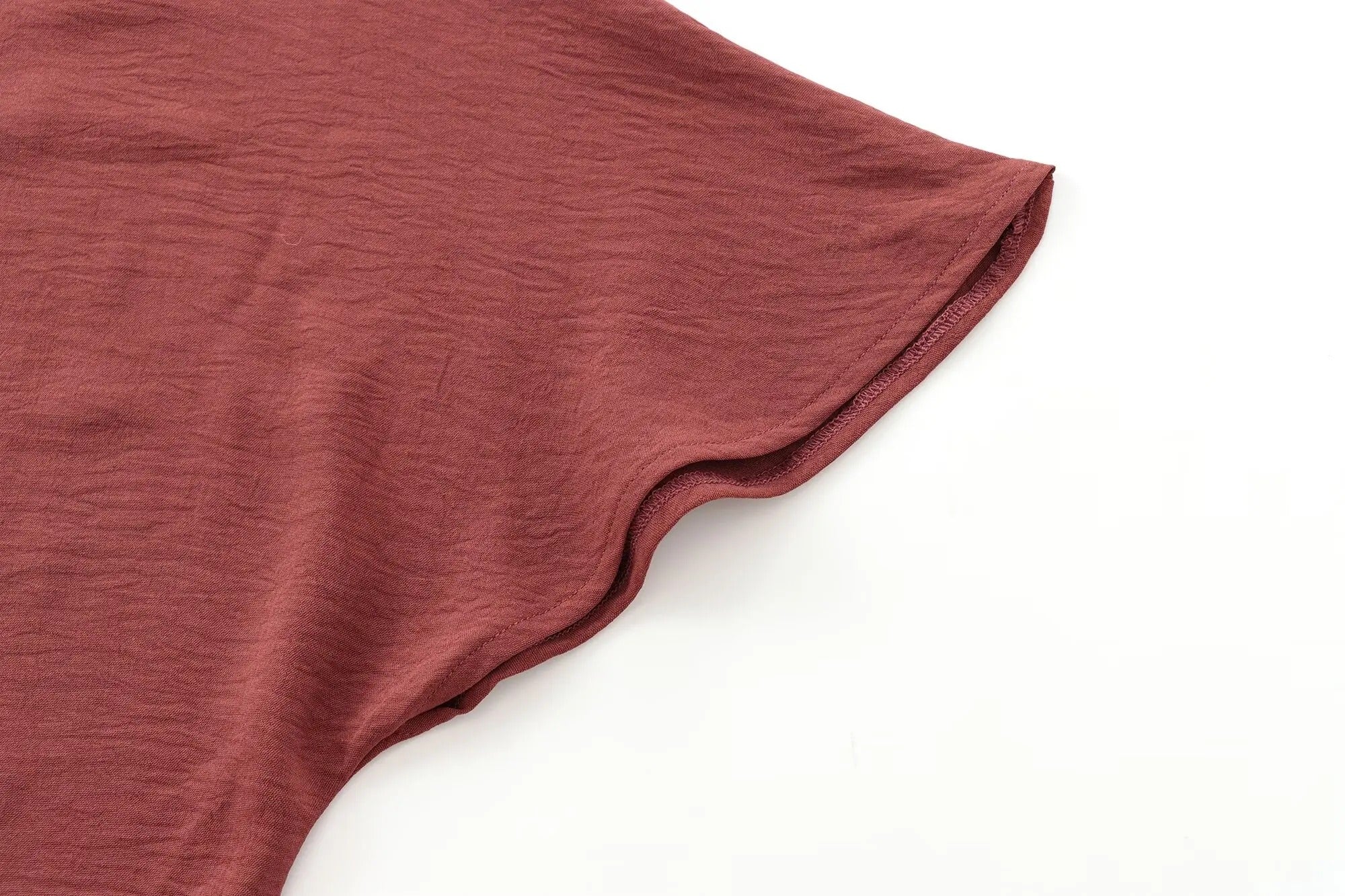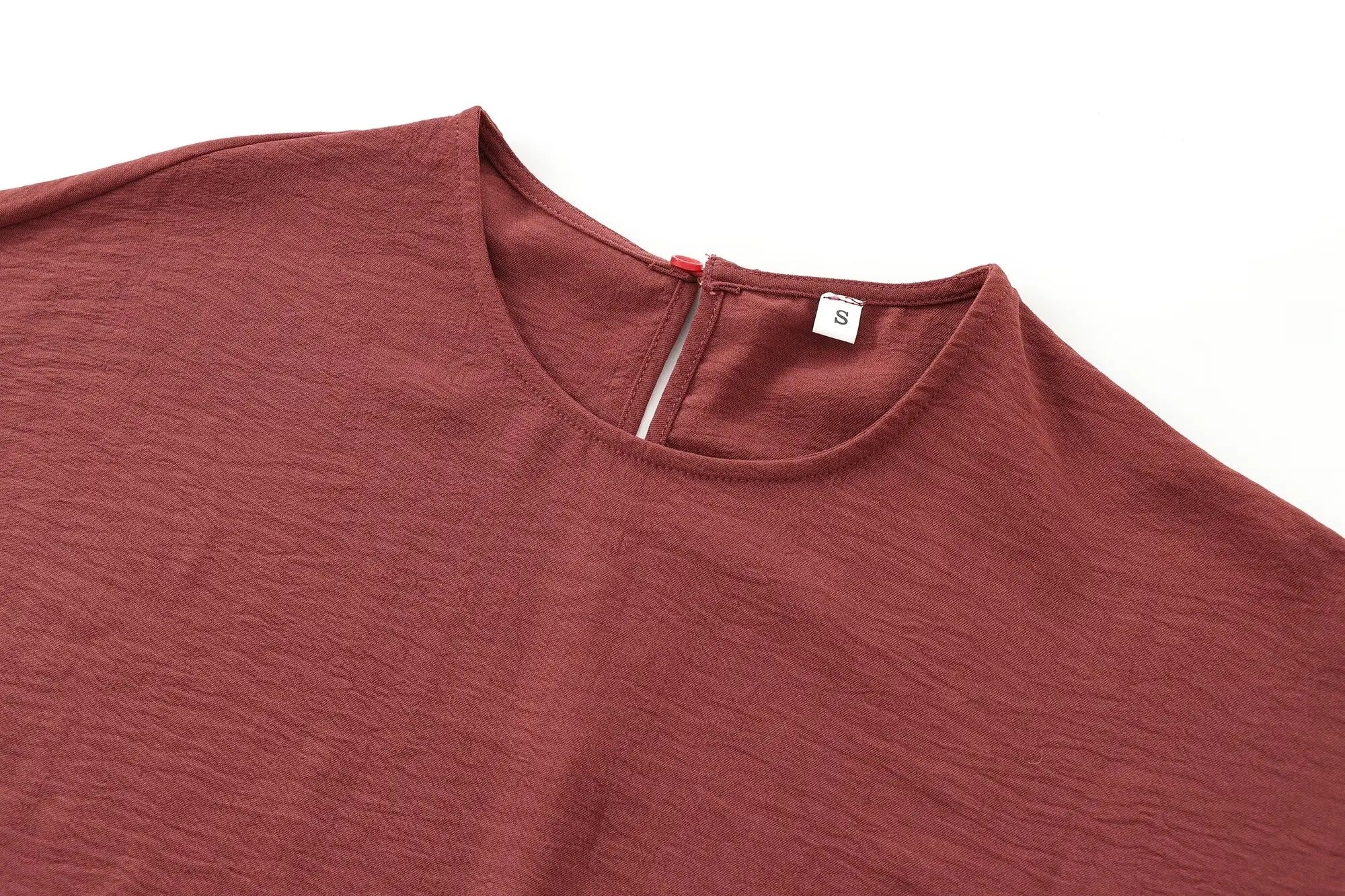 Diseño de largo midi. Cuello redondo. Manga corta holgada. Ajuste de lazos en los laterales. Color teja.