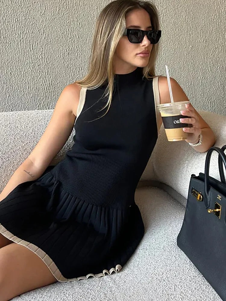 Sin mangas con cuello alto. Falda plisada con detalles en contraste. Diseño cómodo y ligero.